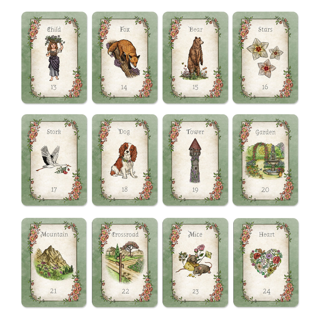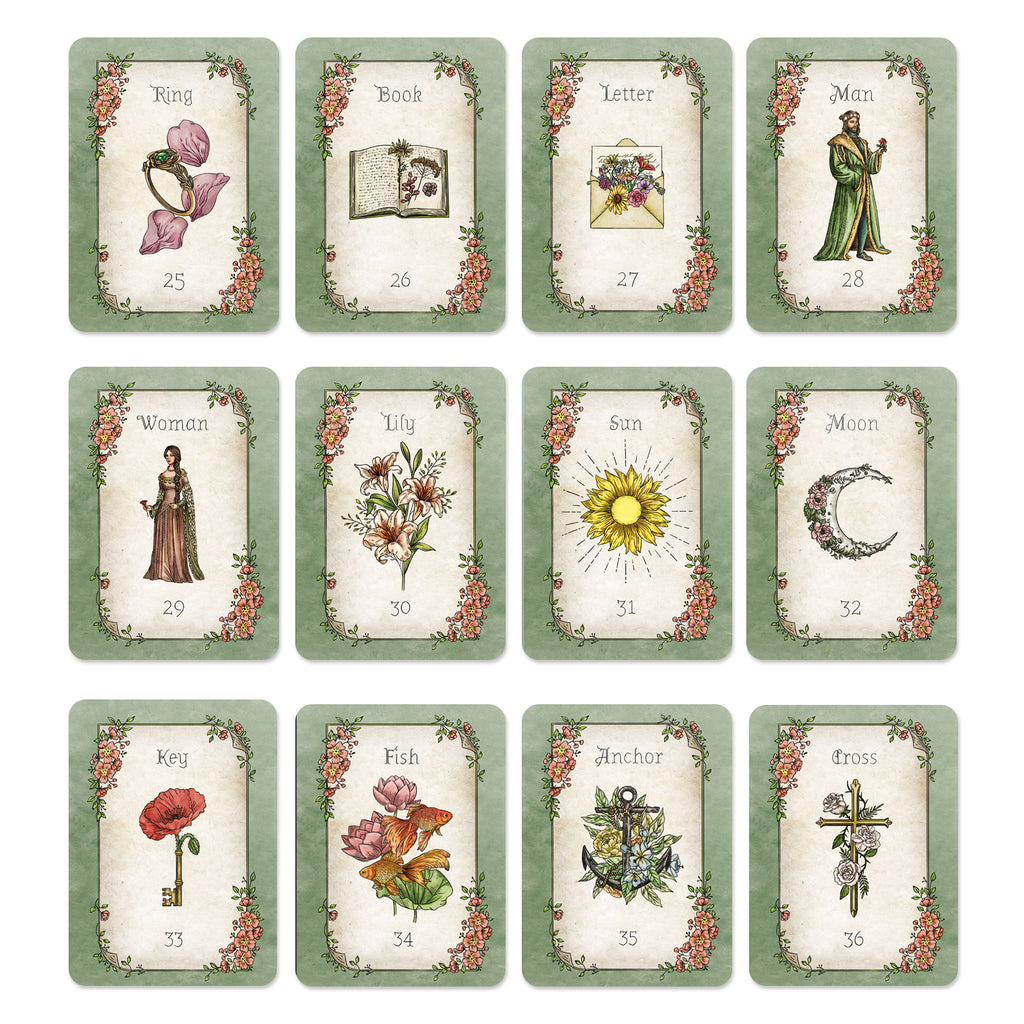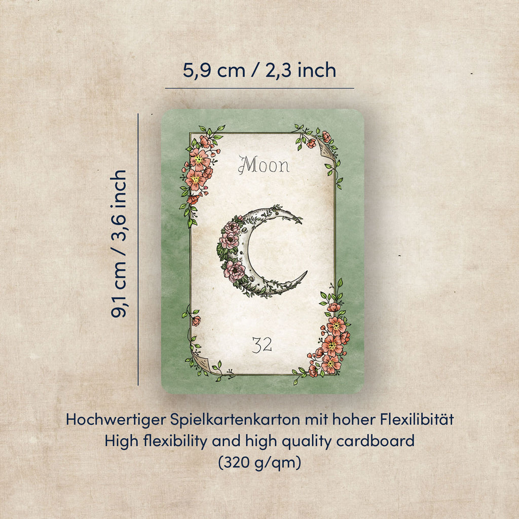 The lovingly illustrated motifs of the Floraneum Lenormand remind your soul of a time far away and a world that was full of beauty and harmony. The medieval appearance of the symbolism is decorated with a romantic floral decoration. The special feature of these cards is the calm and clear representation of the symbols. This creates an intuitive and intensive connection between the reader and the cards, which makes interpreting the cards easier, especially for beginners.
