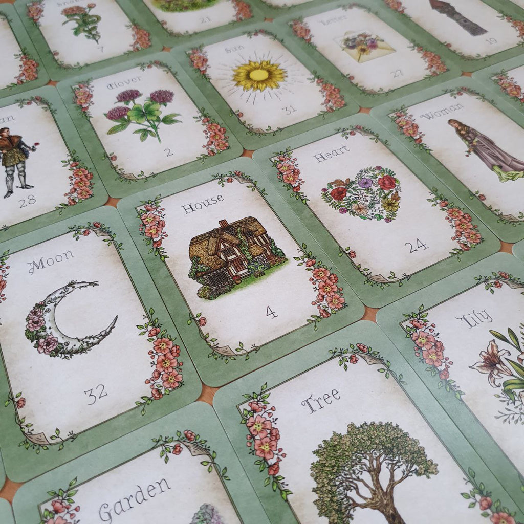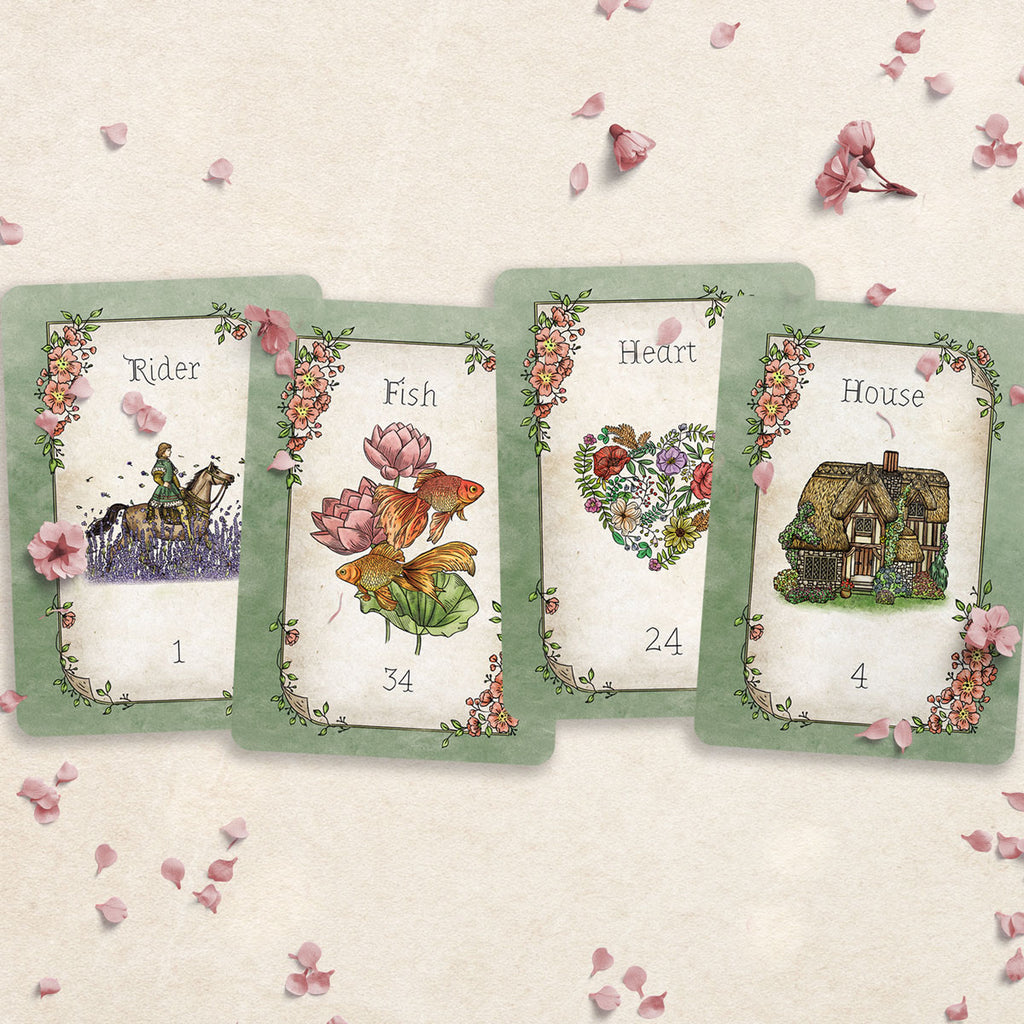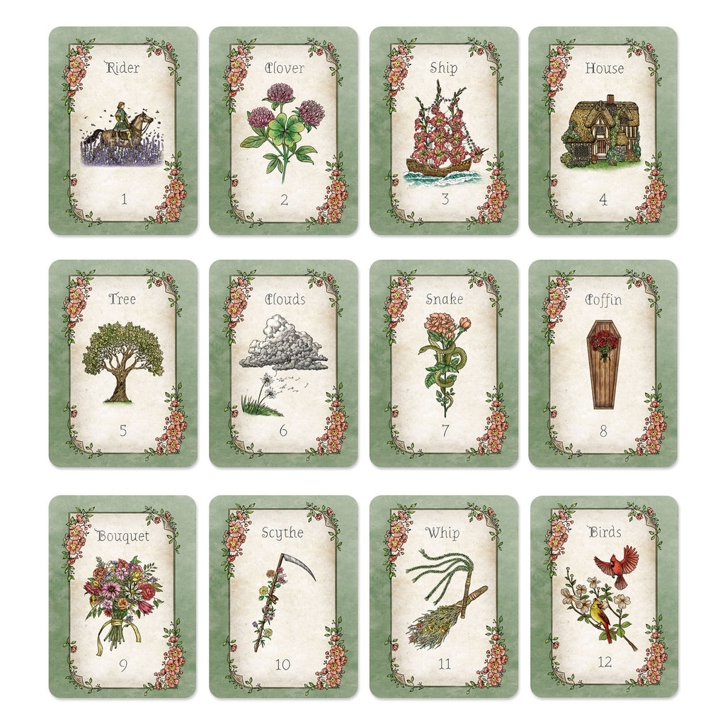 The lovingly illustrated motifs of the Floraneum Lenormand remind your soul of a time far away and a world that was full of beauty and harmony. The medieval appearance of the symbolism is decorated with a romantic floral decoration. The special feature of these cards is the calm and clear representation of the symbols. This creates an intuitive and intensive connection between the reader and the cards, which makes interpreting the cards easier, especially for beginners.