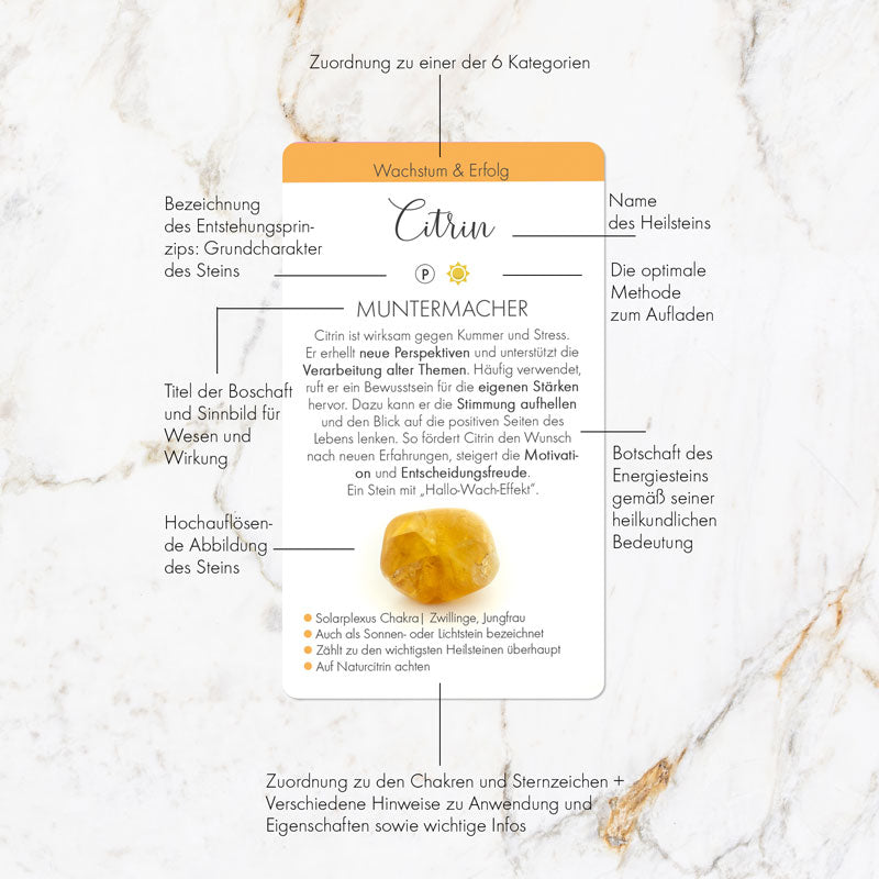 The 36 healing stone power cards focus their messages on the emotional, energetic and spiritual area of effect of the healing stones. They are divided into six subject areas in order to simplify the application and design it according to needs: