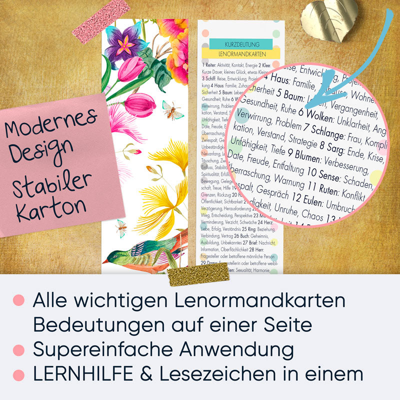 Eine praktische Merkhilfe für die wichtigsten Bedeutungen der Lenormandkarten, zusammengefasst in einem Lesezeichen! Auf der einen Seite ist der “Spickzettel”, auf der anderen ein wunderschönes Design.